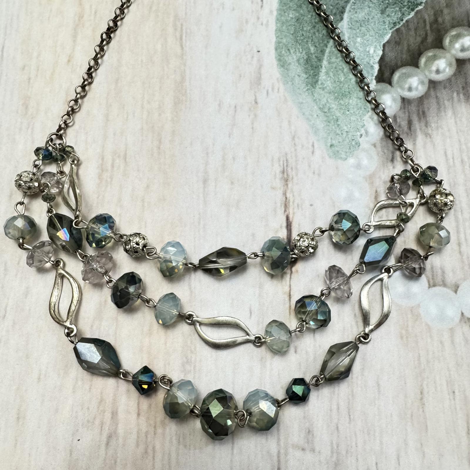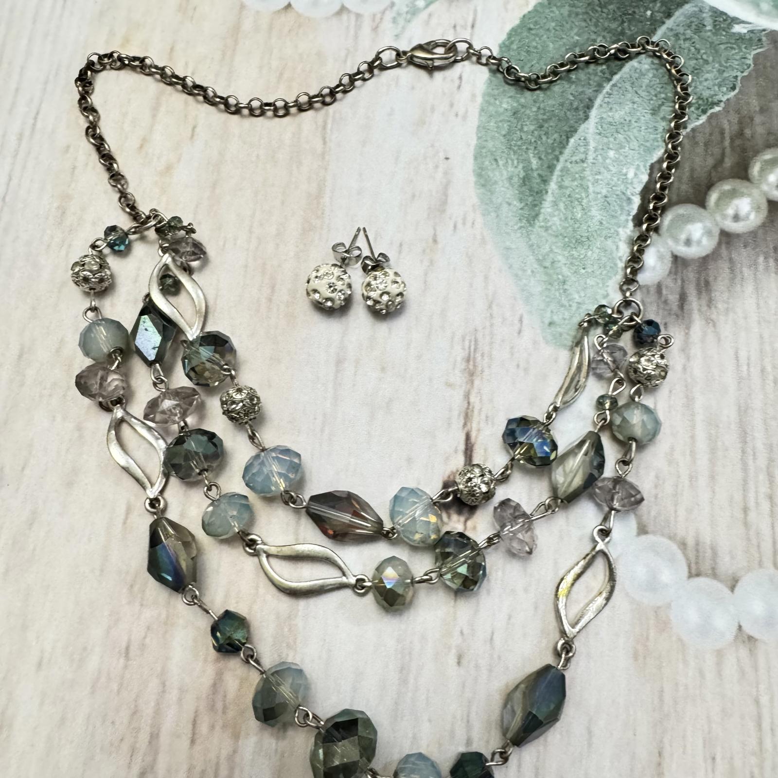 Enhance your jewelry collection with this stunning multi-layered beaded necklace paired with matching earrings. The necklace features an intricate design of shimmering beads in shades of green, gray, and blue, gracefully intertwined with silver-tone metal accents. The matching earrings showcase a chic spherical design adorned with sparkling crystals, perfect for any occasion. This jewelry set is ideal for both casual outings and elegant affairs.