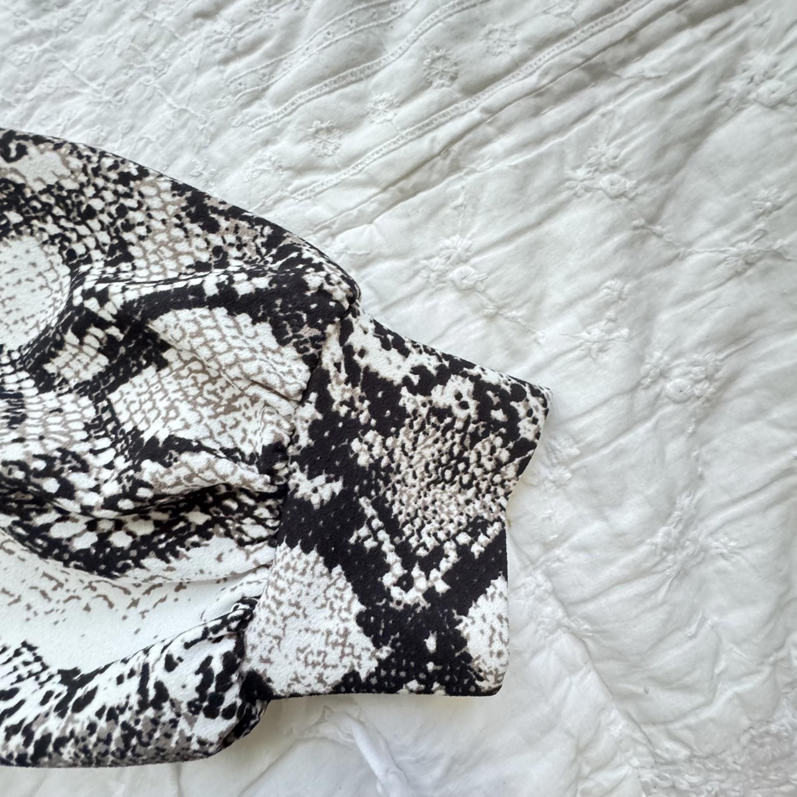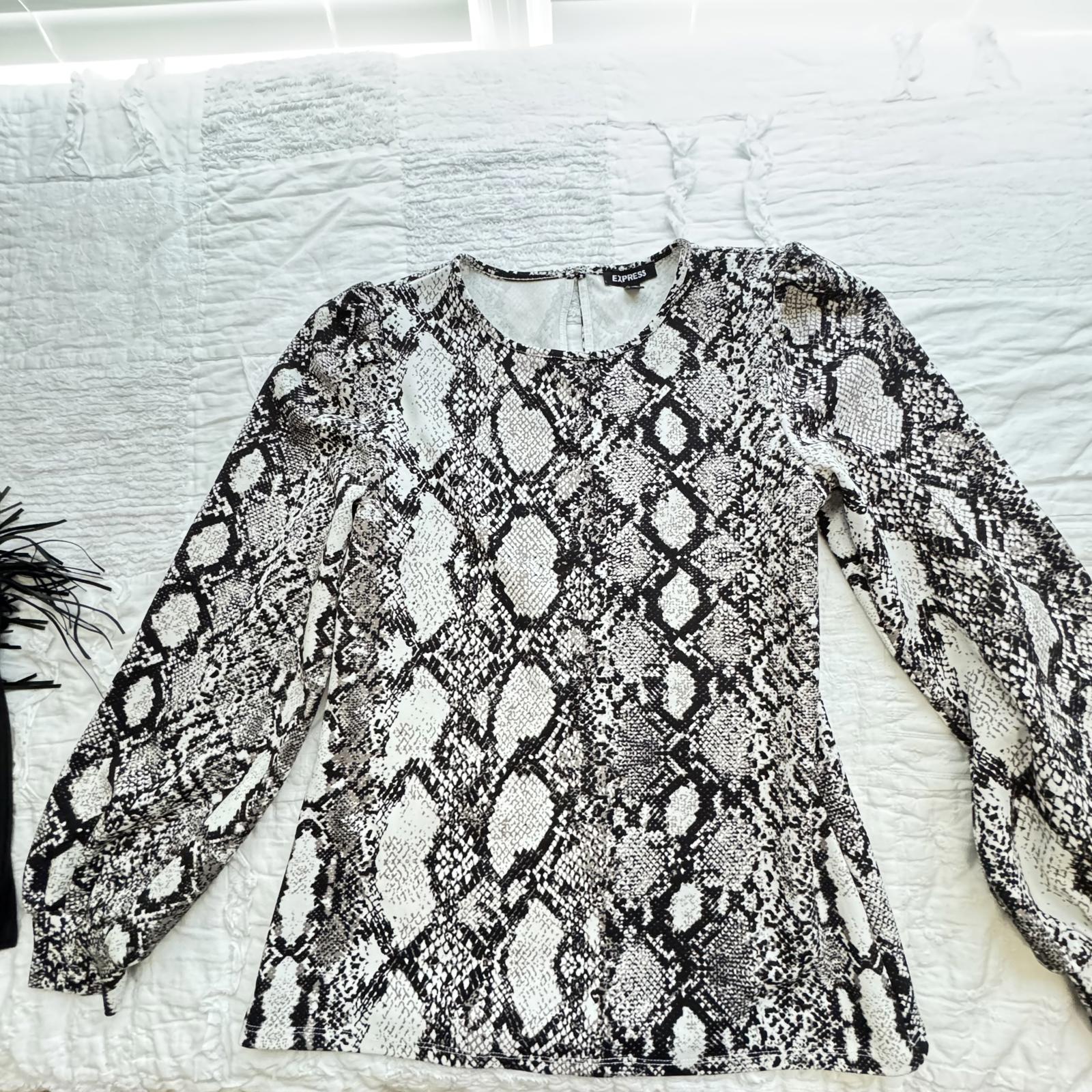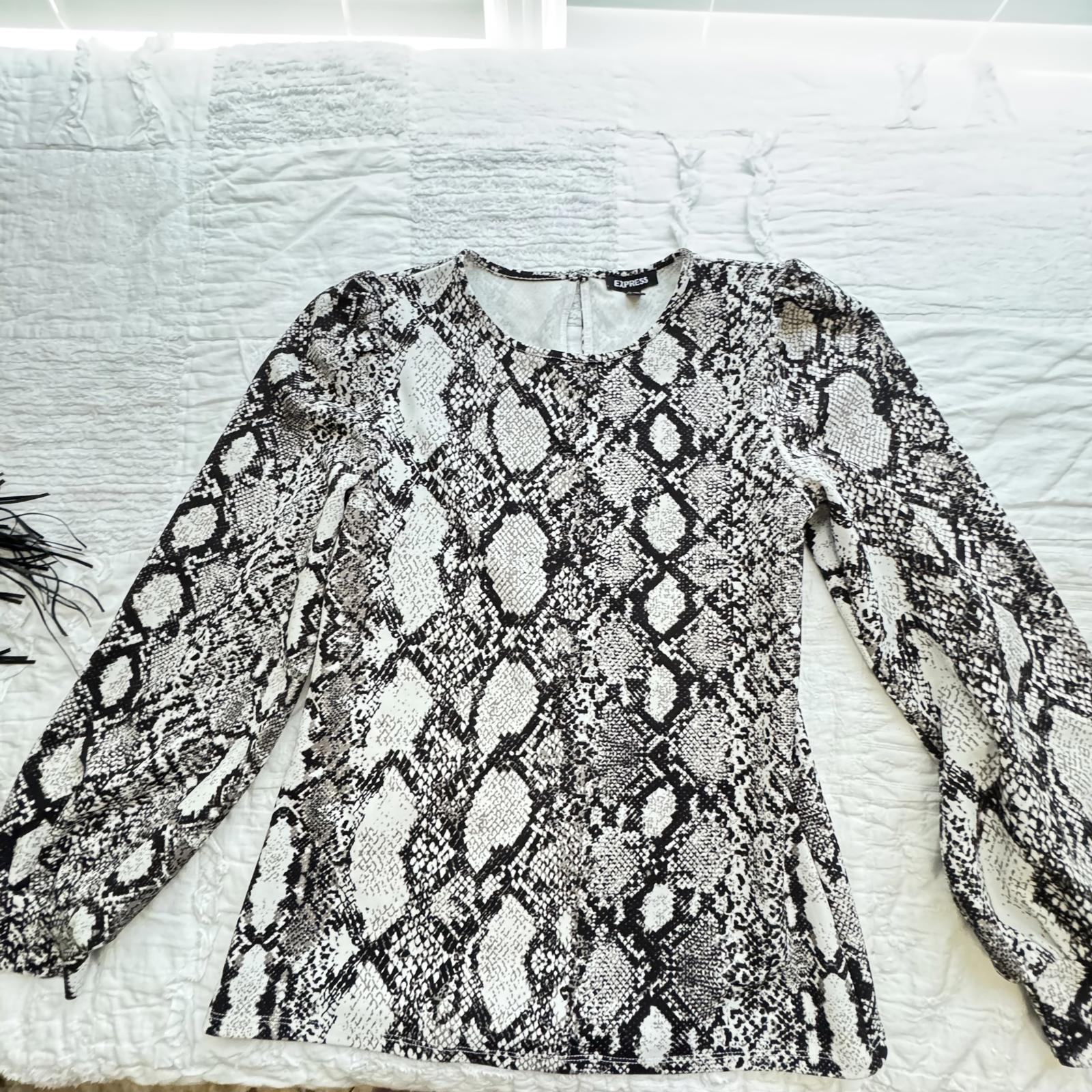 Elevate your wardrobe with this stylish snakeskin print top from Express. Designed for versatility and comfort, this long-sleeve shirt is perfect for both casual outings and elegant evenings. Key features include: - Trendy snakeskin pattern in classic black and white - Flattering fit with slight peplum detailing - Soft and breathable fabric ideal for layering - Comfortable long sleeves with gathered detailing - Brand: Express, size Medium. Pair with jeans or a skirt for a chic look. A perfect addition to any fashion-forward closet!