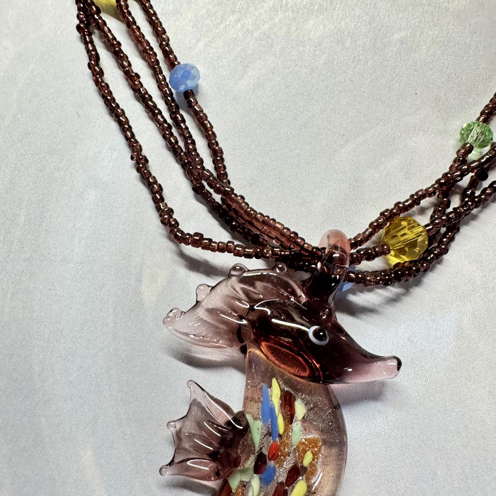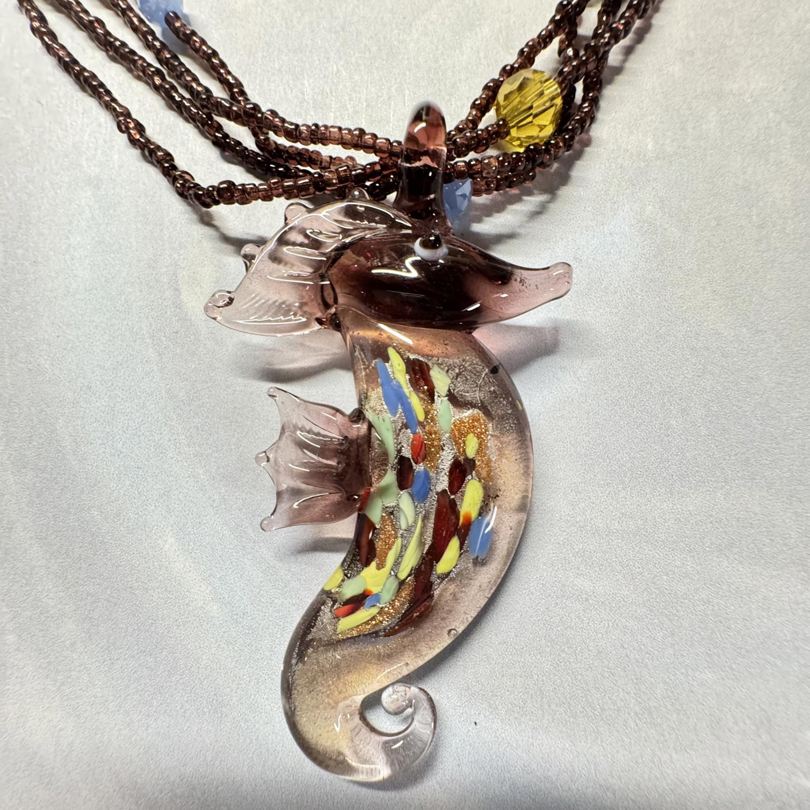 Add a touch of whimsy to your jewelry collection with this exquisite handcrafted seahorse pendant necklace. Made with vibrant glass and adorned with colorful beads, this unique piece captures the beauty of ocean life. Perfect for beach lovers and those who appreciate artistic jewelry. Features include: