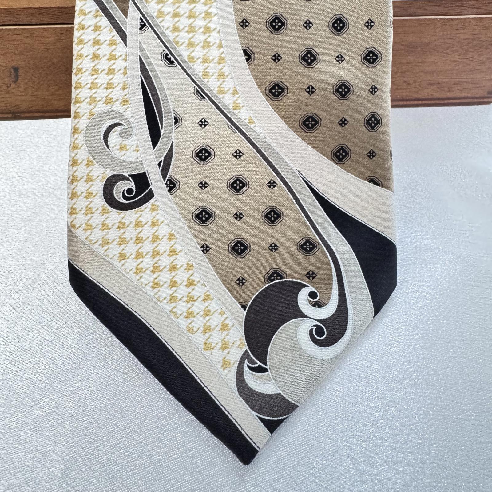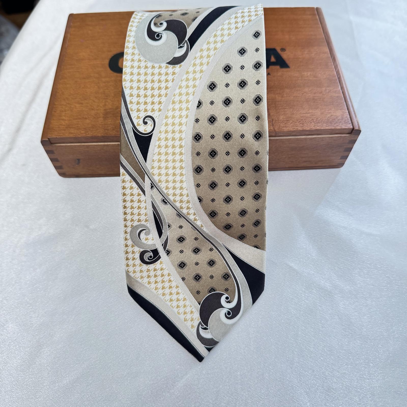 Unusual pattern designer silk tie. Featuring an elegant blend of geometric patterns and swirls, it combines classic sophistication with a modern twist. Perfect for business meetings, weddings, or any special occasion. Made from high-quality silk, this tie offers a luxurious feel and stunning appearance.