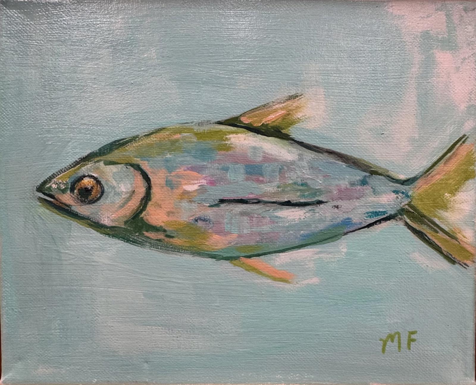 Soft Current II is an original 8 x 10 acrylic painting on canvas featuring a contemporary interpretation of a coastal fish rendered in layered, painterly color. Muted aqua and seafoam create a calm atmospheric background, while soft coral, olive, blush, and pale gold tones build dimension across the body.