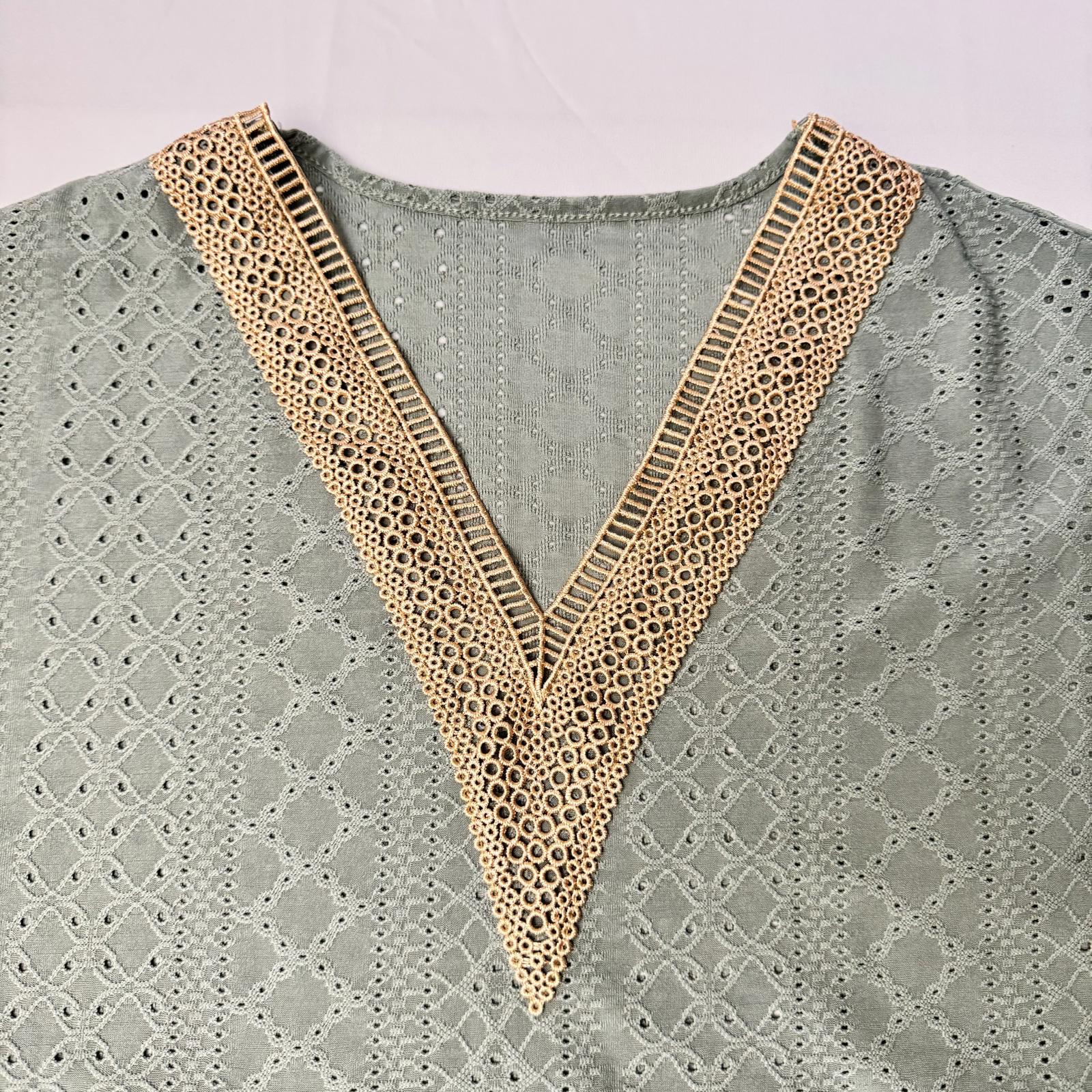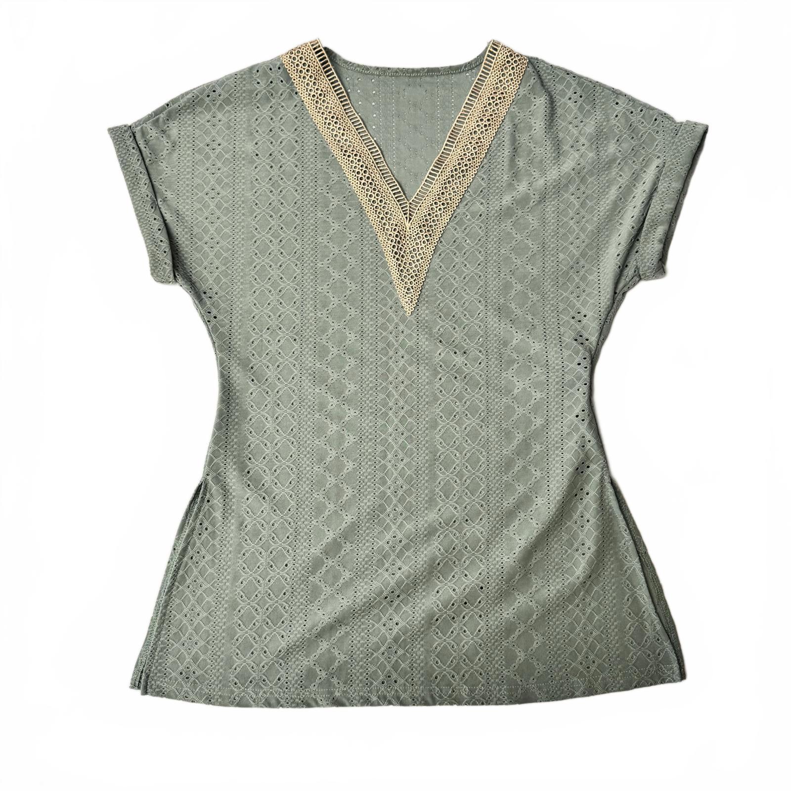 Discover the perfect blend of comfort and style with this elegant mint green blouse featuring a chic V-neck design. Crafted with intricate crochet detailing along the neckline, this top is perfect for any casual outing or special occasion. The lightweight fabric and perforated design add a breathable touch, making it ideal for warmer days. With short sleeves and a flattering cut, it offers a modern silhouette that pairs well with jeans or shorts. - Stylish mint green color - V-neck with beautiful crochet trim - Lightweight and breathable fabric - Flattering fit with short sleeves - Versatile for any occasion