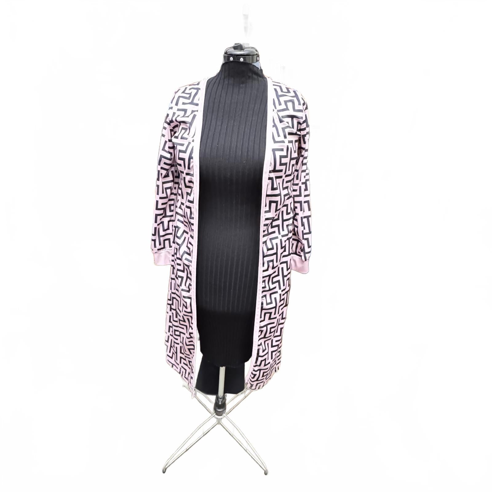 Elevate your wardrobe with this stunning patterned co-ord set, perfect for any stylish occasion. Featuring a modern geometric design in soft pink and black tones, this outfit combines elegance with comfort. Ideal for brunch dates or casual outings, it includes: - Longline duster with open front - Matching tapered trousers with a relaxed fit - Soft, silky fabric for all-day wear - Versatile style that can be dressed up or down. Embrace a chic look with this fashionable set that captures attention effortlessly.