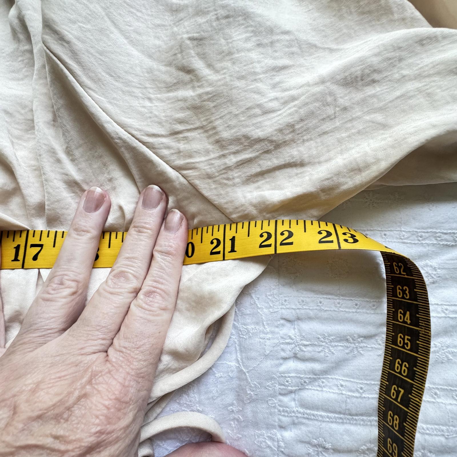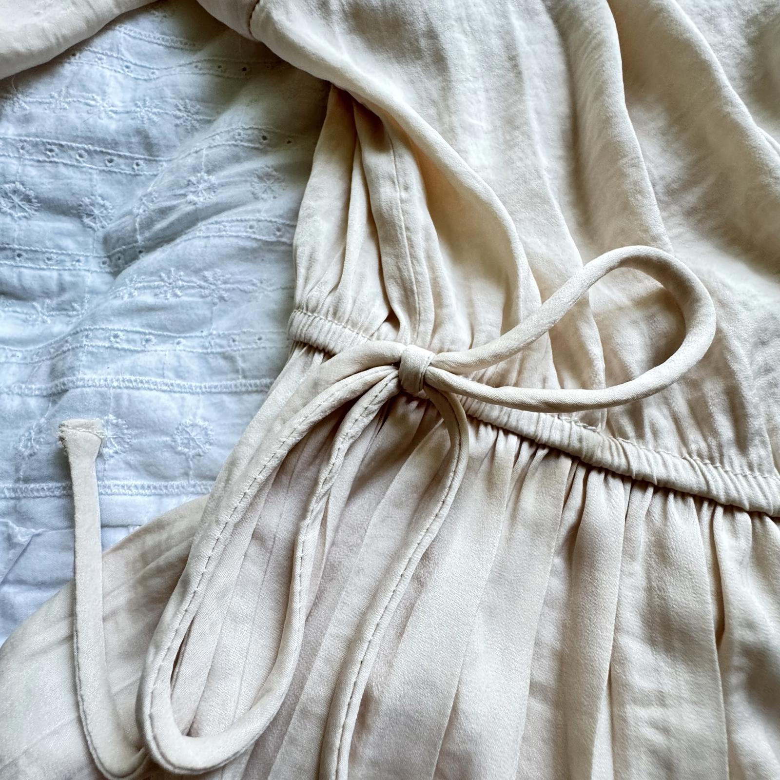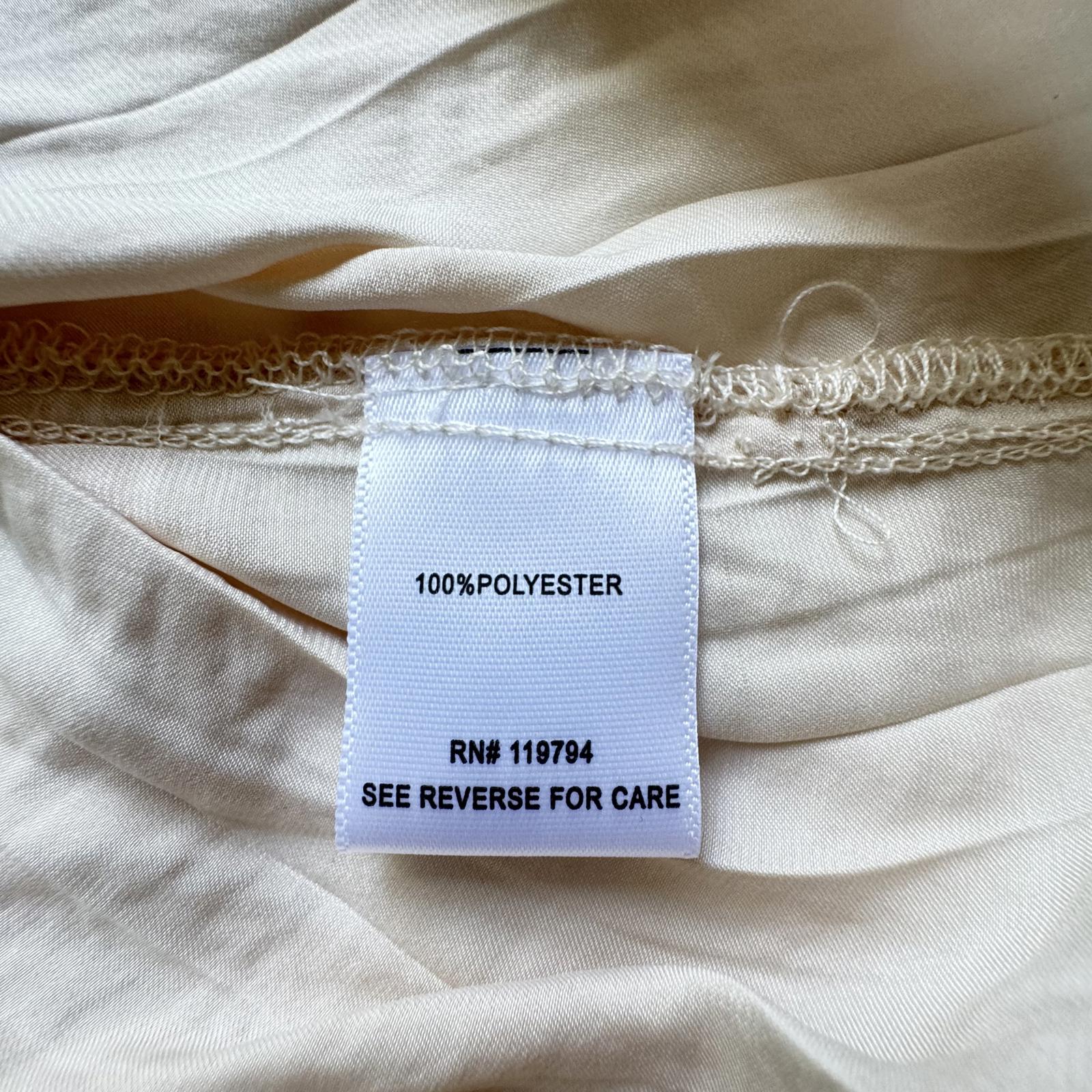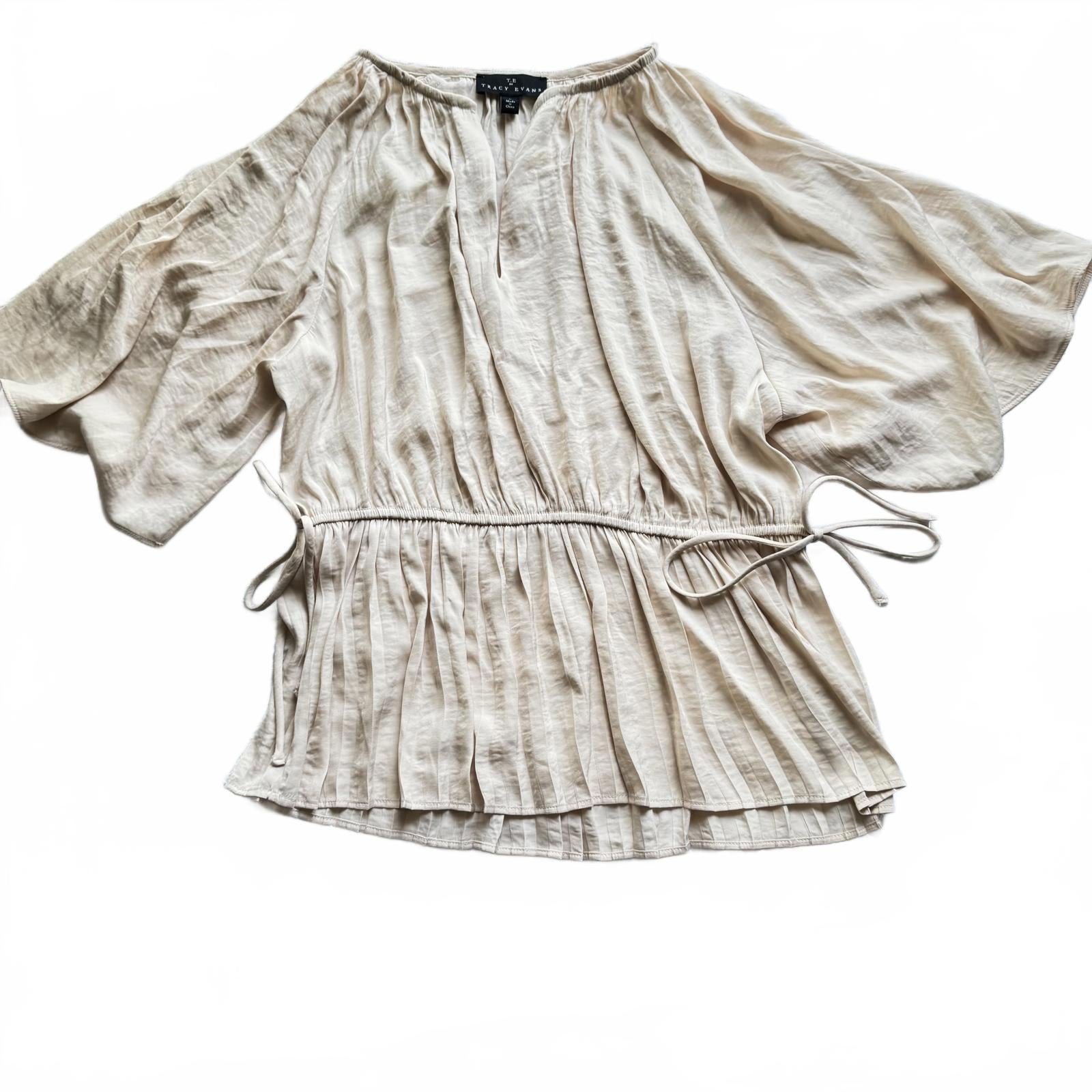 Elevate your wardrobe with this elegant cream blouse from T.E. by Tracy Evans. Featuring a relaxed fit and soft fabric, this top is perfect for casual outings or dressed-up occasions. Key features include:- Lightweight, breathable material for comfort - Elegant deep V-neck with subtle pleating - Adjustable drawstring waist for a flattering silhouette - Flowing bell sleeves for added style - Made in China, Size L. This blouse seamlessly combines style and comfort, making it a staple for any stylish wardrobe.
